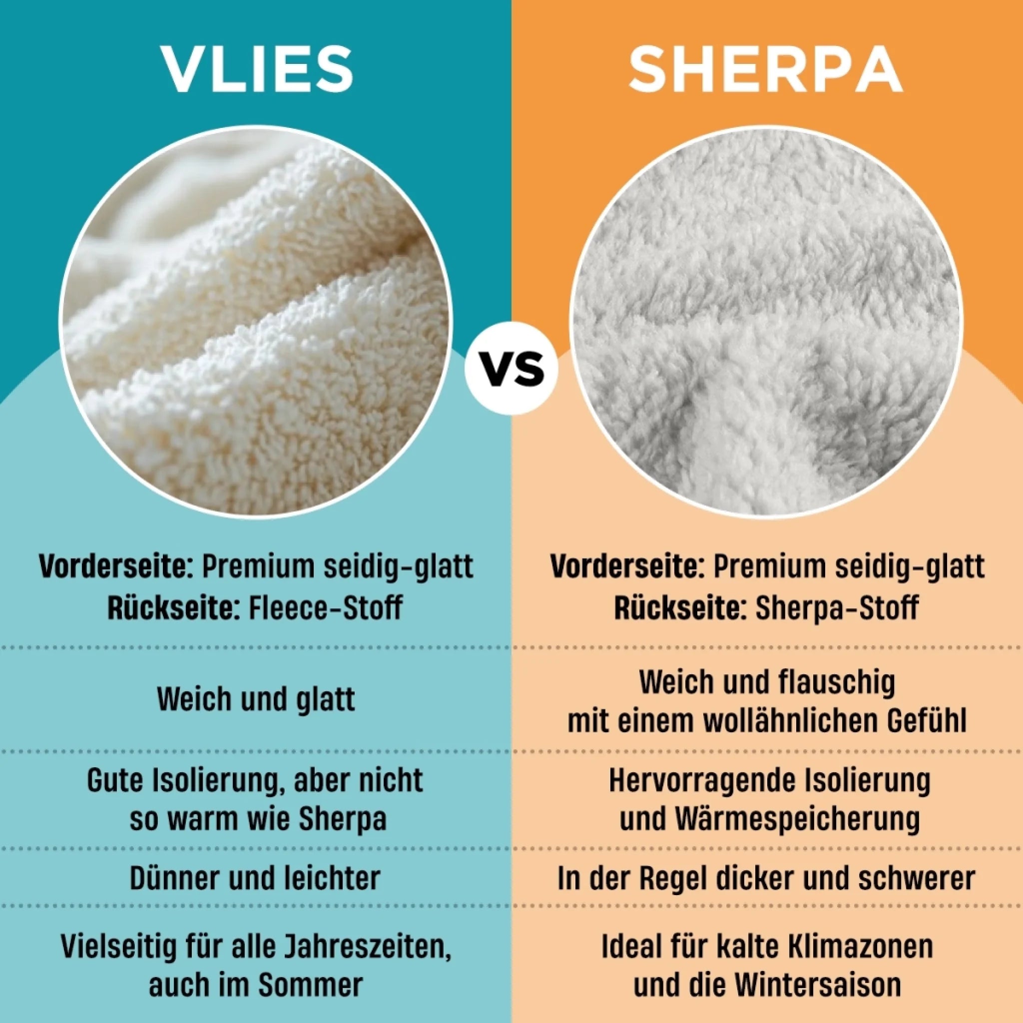 Materialoptionen: Fleece oder Sherpa – wählen Sie das Material, das am besten zu Ihnen passt.