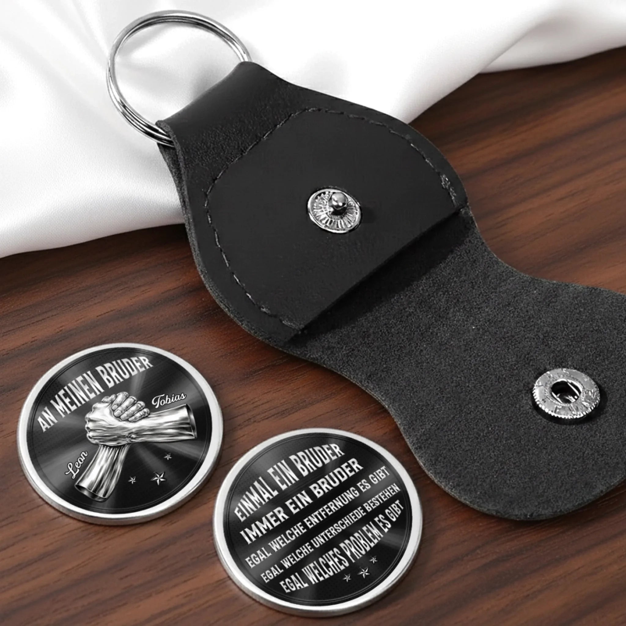 Verpackung: Edelstahl-Token und PU-Leder-Hülle enthalten